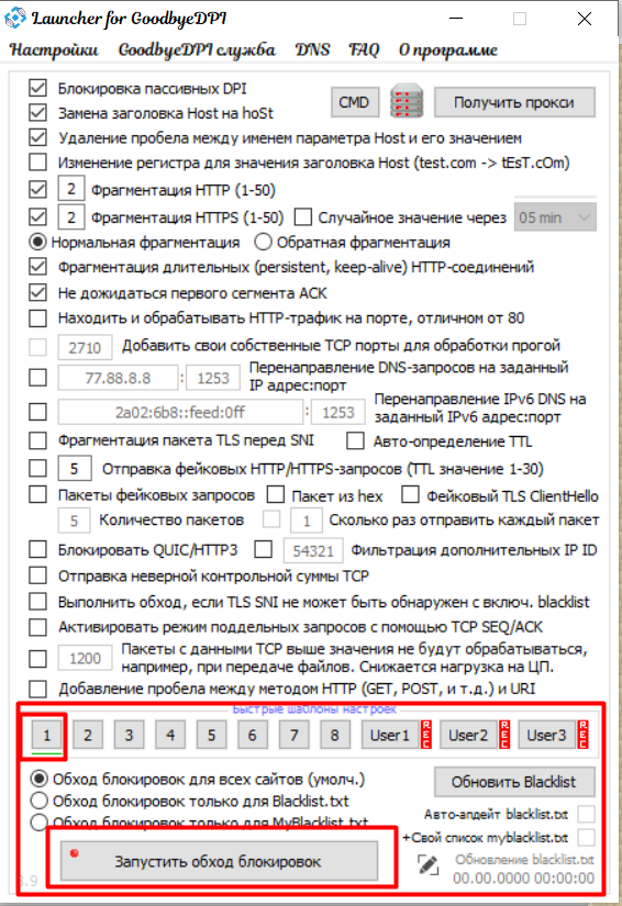 Открывается программа. В самом низу синеньким будет написано быстрые шаблоны настроек, там будут цифры 1 2 3 4 5 6 7 8, Выбираем сначала 1 и нажимаем "Запустить обход блокировок" если не помогло, выбираем цифру 7 и нажимаем "Запустить обход блокировок"